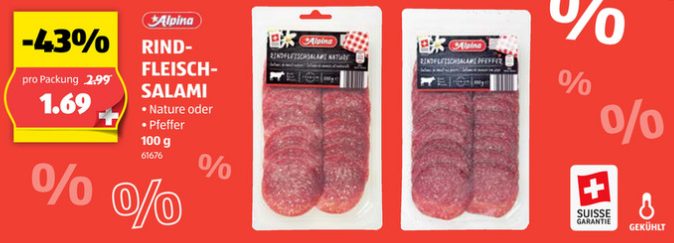 Auch in Aktion ist die Rindersalami à 100g, diese gibt’s für faire 1.69 Franken!