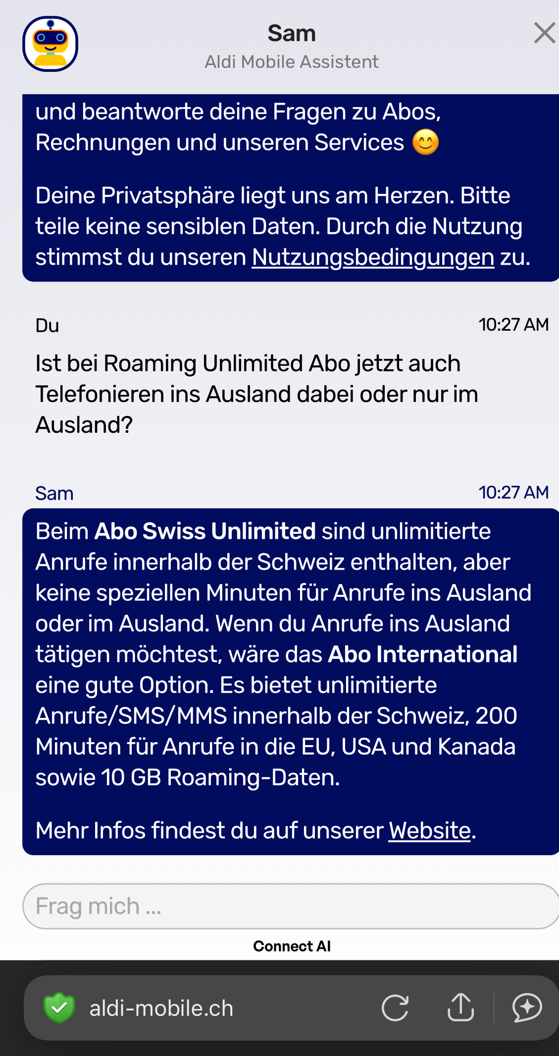 Sam der Ai Bot von Aldi Mobile sagt ebenfalls, dass Telefonie ins Ausland nicht inklusive ist.