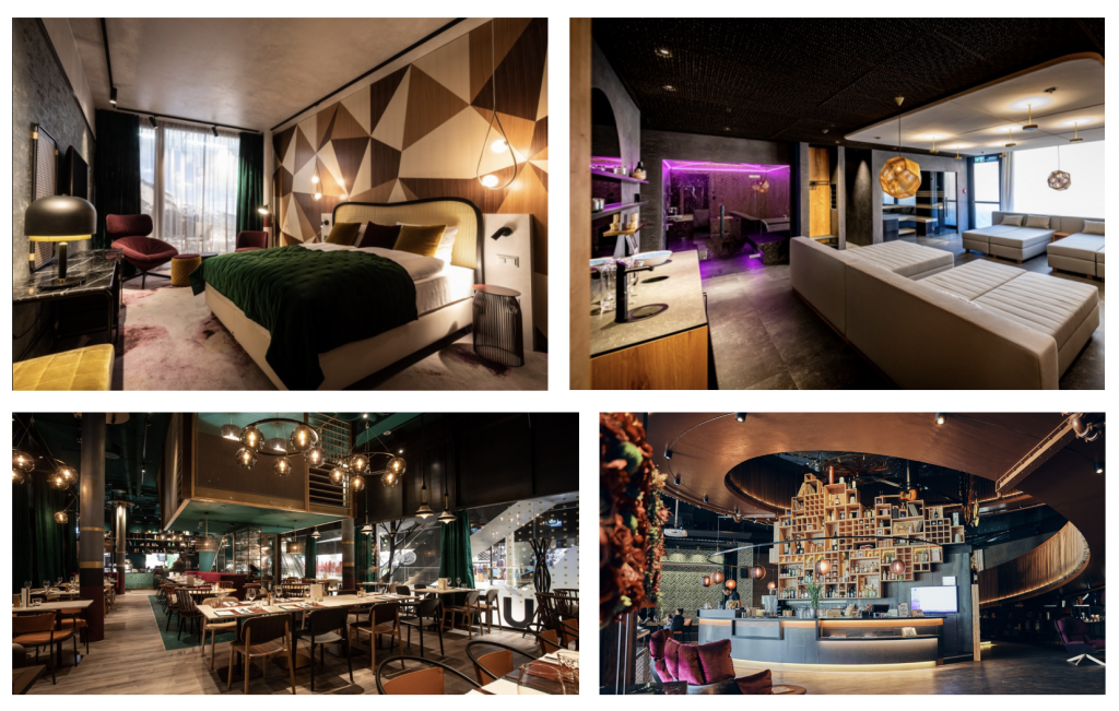 Im Foto: Doppelzimmer (links oben), Wellnessbereich (rechts oben), Restaurant „The Deli“ (links unten), Bar (rechts unten)