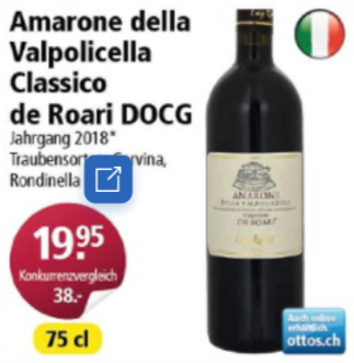 Bei Otto’s gibt’s nur noch bis morgen wieder einige gute Angebote. Habe zwar letzte Woche schon in den Prospekt geschaut, konnte aber auf den ersten Blick wenig Vergleichbares finden. Nun ist mir der Rotwein Amarone della Valpolicella Classico de Roari DOCG für 19.95 Franken ins Auge gefallen. Dieser kostet sonst als ’10er Jahrgang ca. 29.95 Franken, als ’16er Jahrgang gar fast 38 Franken. Ihr erhaltet hier allerdings eine Flasche aus dem Jahrgang 2018, was laut falstaff für norditalienische Rebsorten ein gutes Jahr war.