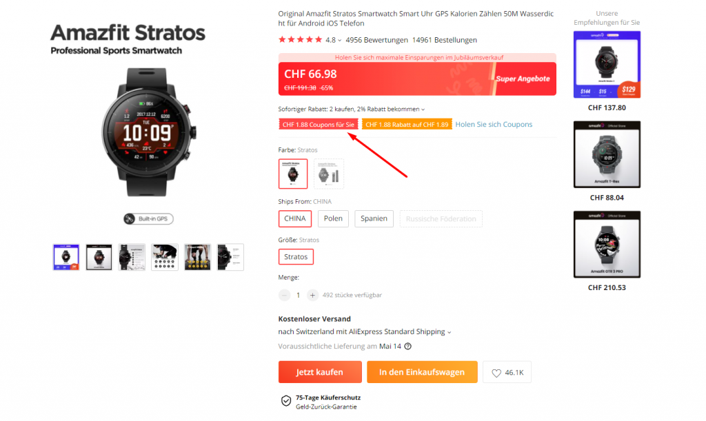 Bei AliExpress gibt’s gerade die Amazfit Stratos Smartwatch für CHF 65.10 Dazu muss man bei AliExpress angemeldet sein und den Gutscheincode einlösen: