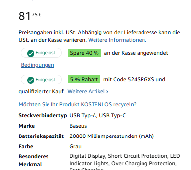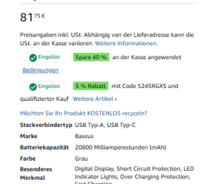 Auf Amazon gibt es gerade die Baseus EnerGeek Powerbank mit 100W / 45W USB-C Anschlüssen und 20.800mAh – also spezieller für Laptops im Angebot durch 40%-Coupon für aktuell 49,97 statt 76,61 Franken inkl. Versand.
