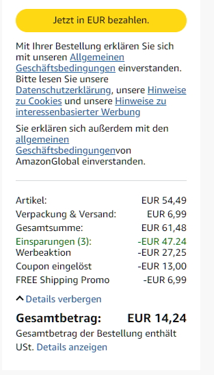 Es braucht abgesehen davon etwas Grduld, bis der Tiefpreis angezeigt wird. Wie immer erst auf der allerletzten JETZT Kaufen Seite wird er angezeigt. Wie das Bild zeigt werden alle Rabatte gewährt und der Versand ist auch noch gratis und schnell. Sehr cool.