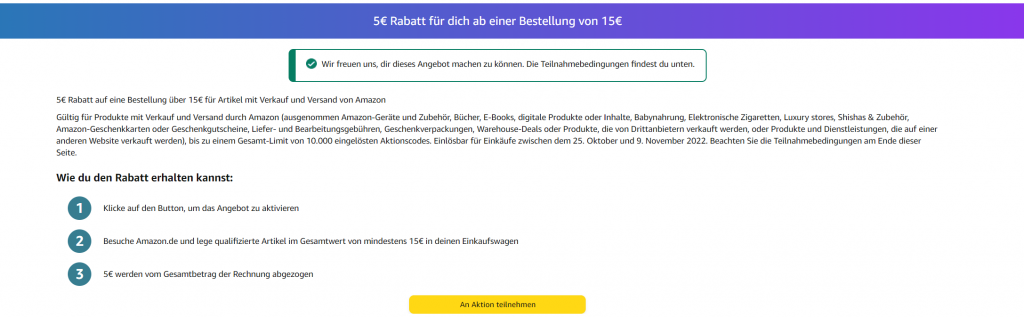• Dieses Angebot gilt aussschließlich für Personen, die per Onsite-Marketing Banner, Email oder Push-Benachrichtigung von Amazon eingeladen wurden und das Banner „Wir freuen uns, dir dieses Angebot machen zu können “ auf der Internetseite https://www.amazon.de/gp/browse.html/?node=30119303031 sehen können während du mit deinem Amazon Konto eingeloggt bist. Der Aktionsgutschein wird automatisch zu deinem Konto hinzugefügt, wenn du auf die Schaltfläche „Aktionsgutschein erstellen“ klickst und einen Kauf zwischen dem 25. Oktober und 9. November 2022 abschließt. Kund :innen können auf folgender Seite prüfen, ob das Angebot für sie gilt: https://www.amazon.de/b?node=30119303031.