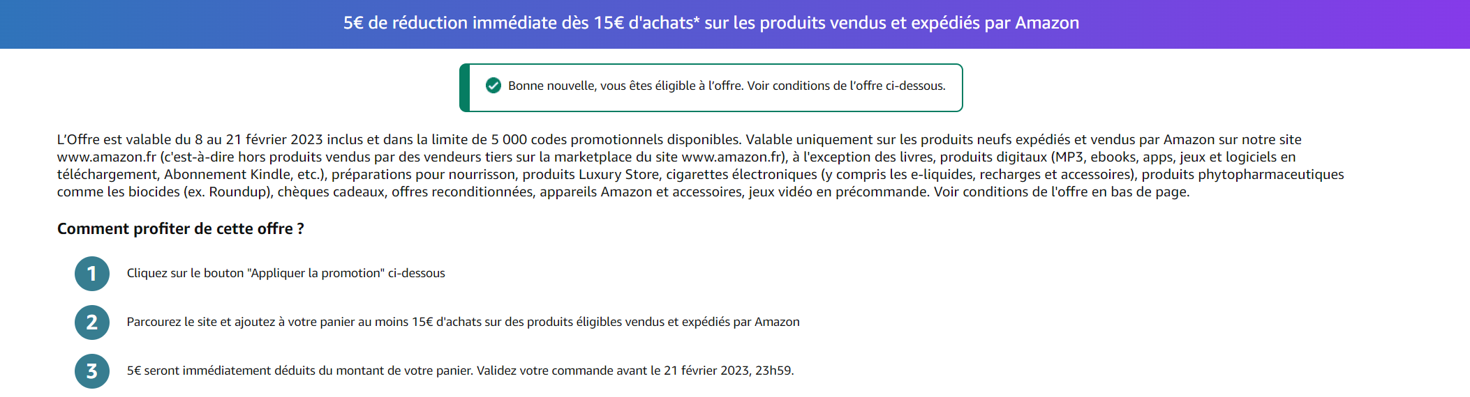 Dieses Angebot ist nur auf Einladung erhältlich. Amazon-Nutzer, die (i) persönlich per E-Mail, Push-Benachrichtigung oder Banner auf Amazon.de zu diesem Angebot eingeladen wurden und (ii) das Banner „Sie sind für dieses Angebot qualifiziert“ oben auf der Internetseite https://www.amazon.fr/gp/browse.html/?node=57374558031 sehen können, auf der das Angebot vorgestellt wird, erhalten einen Gutscheincode im Wert von 5€, der vor dem 21. Februar 2023, 23:59 Uhr auf amazon.de für einen qualifizierten Einkauf von mindestens 15€ auf der Website von Amazon.de (das „Angebot“) eingelöst werden kann.