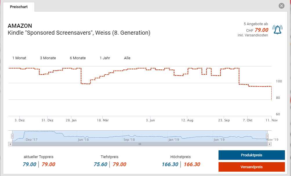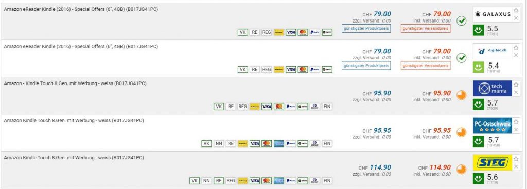 Bei galaxus und digitec gibt es das Amazon Kindle (2016) für den neuen Bestpreis von CHF 79.-. Der vorherige Bestpreis und auch zweitbeste Preis beträgt CHF 95.90.