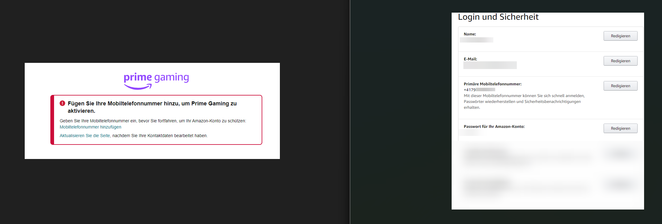 Habe eine Mobilenummer hinterlegt aber erhalte auf gaming.amazon.com immer die Fehlermeldung es sei keine Mobilenummer hinterlegt. Verwende das gleiche Amazonkonto beim Einloggen. Einen Ansatz woran es liegen könnte?