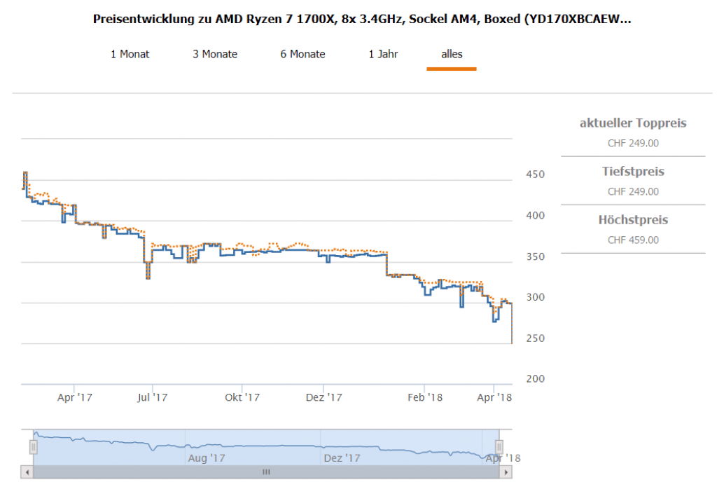Bei microspot bekommt man gerade den AMD Ryzen 7 1700X / 3.4 GHz Prozessor zum Schnäppli-Preis von CHF 239.- wenn man den Gutscheincode HFNEU7 beim Checkout eingibt. Der zweitbeste Preis in der Schweiz liegt bei CHF 298.55. Hier der Preisverlauf, günstiger als jetzt gab’s den Prozessor in der Schweiz noch nie.