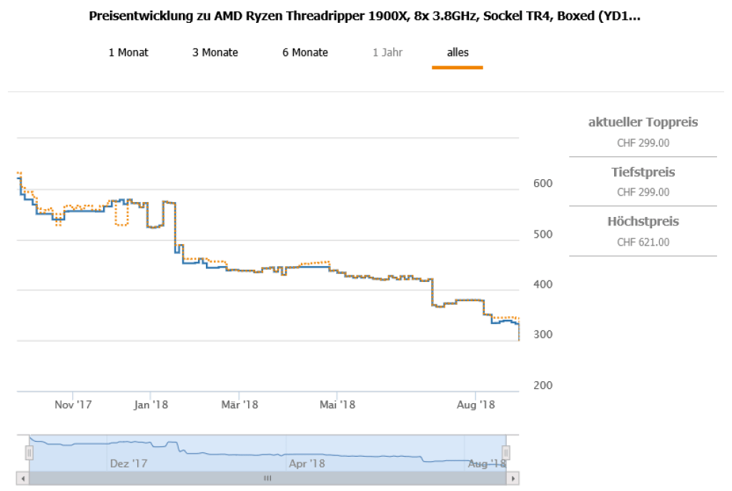 Gemäss toppreise gab es den CPU bislang nie günstiger als für 343.90 CHF, was aktuell auch der zweitbeste Preis ist.
