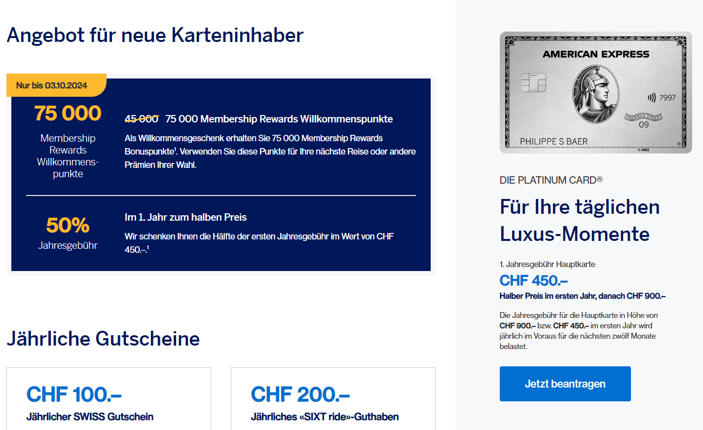 Ein wichtiger Punkt in den Bedingungen sollte nicht unerwähnt bleiben: "Kündigt die Antragstellerin bzw. der Antragsteller den Kartenvertrag innert 13 Monaten nach Kartenausstellung, so verfällt der Willkommensbonus ersatzlos: Die MR-Punkte werden abgezogen oder zurückgefordert, und die reguläre Jahresgebühr (bei Amex Platinum CHF 900.–; bei Amex Gold CHF 350.–) gilt auch für das 1. Jahr. Swisscard belastet den Differenzbetrag entweder dem Kartenkonto oder stellt ihn separat in Rechnung."