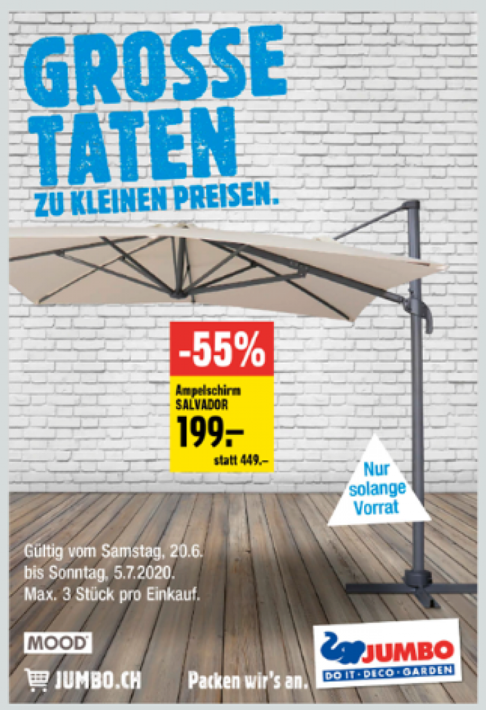 Bei Jumbo erhält man den Ampelschirm Salvador gerade für CHF 199.- Gültig bis am 5. Juli. Der Preis gilt leider nur bei Abholung, ansonsten fallen über 90 Franken Versandkosten an. Man kann sich den Ampelschirm aber bequem über den Onlineshop in einer Filiale reservieren (Click & Collect)