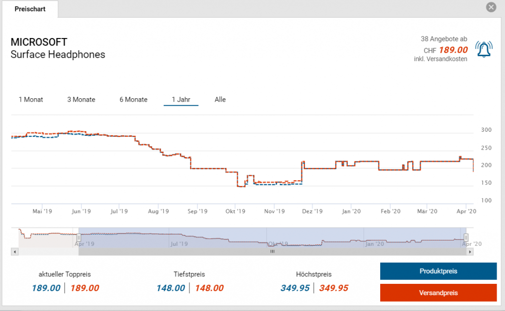 Bei digitec gibts die Surface Headphones wieder einmal zu einem erträglichen Preis. Besptreis bisher waren 138 Franken vor einigen Monaten in diesem Deal, zurzeit sind sie ansonsten nirgends anders für unter 225 Franken zu haben.