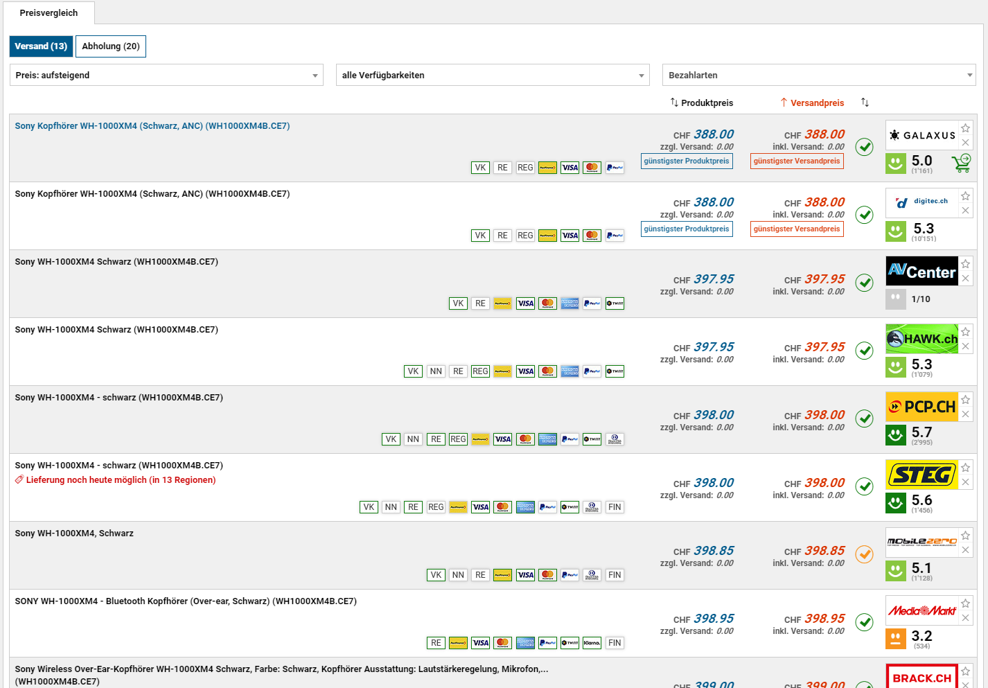 Bei Amazon Spanien gibt’s heute den neuen ANC-King WH-1000XM4 von Sony zum neuen Bestpreis von CHF 298.74 inklusive Versand in die Schweiz. In der Schweiz starten die Preise derzeit ab CHF 388.-