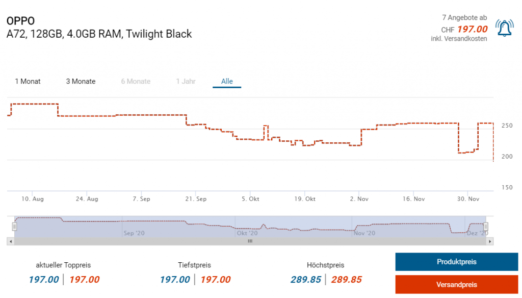 Bei Amazon gibts derzeit das gut ausgestattete Midrange-Smartphone A72 von Oppo zum Aktionspreis von 176 Franken, laut toppreise starten die Preise hierzulande bei 197 Franken (in Aktion!) bei digitec.