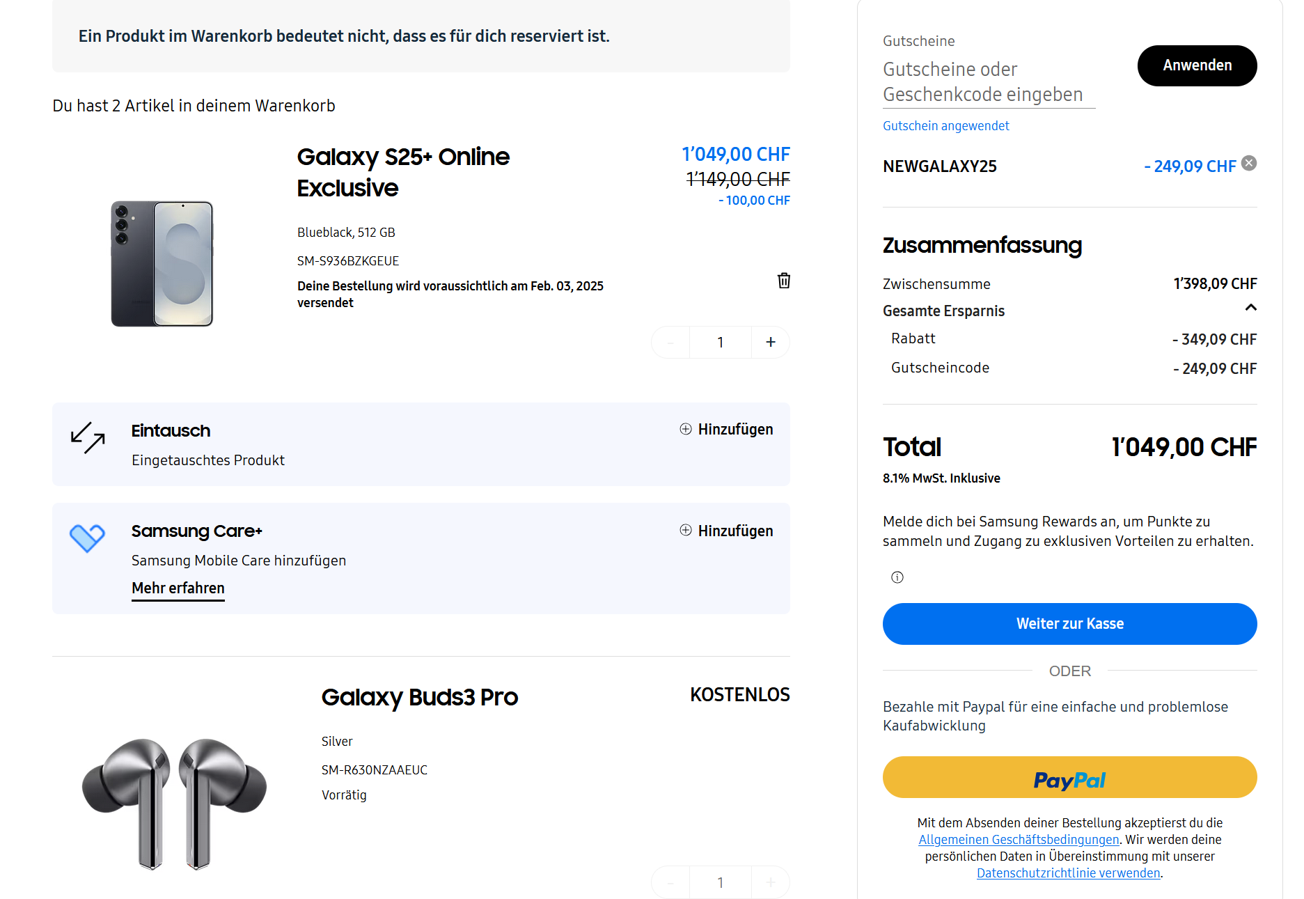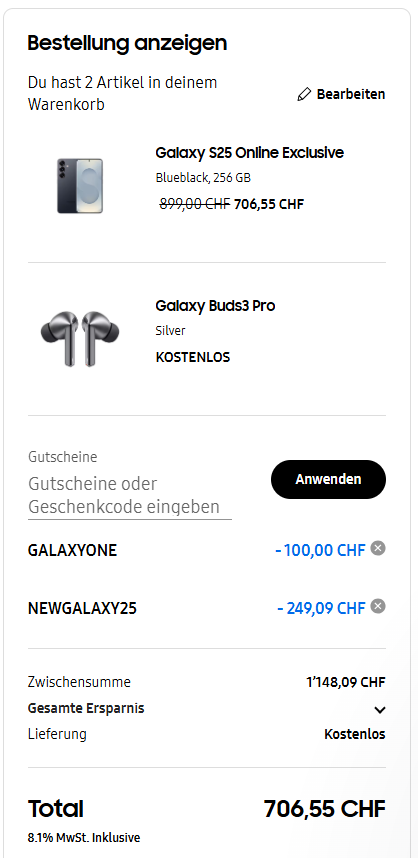 also ich verstehe etwas irgendwie nicht. Wenn ich das Galaxy S25 bei Samsung online kaufe ohne irgendwelche Rabattcodes dann würde mich das Fr 899.-- kosten. Mit den beiden Rabattcodes Galaxyone und Newgalaxy25 müsste der Preis doch um 349.08 tiefer sein. Samsung setzt einen Fantasiepreis, zieht dann den Rabatt ab und jetzt würde das Handy mit allen Rabatten Fr 799.-- kosten