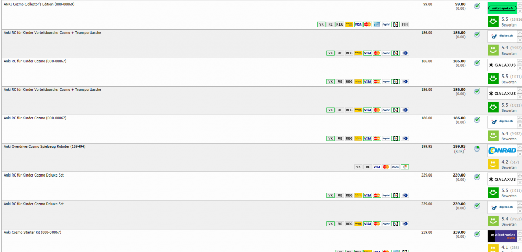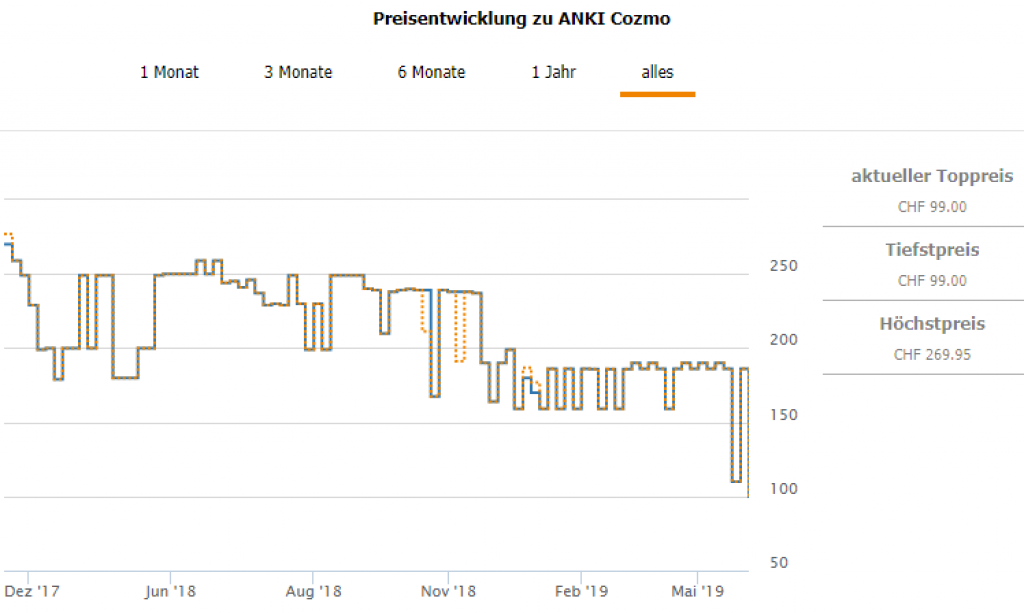 microspot hat heute im Tagesdeal den ANKI Cozmo Collector’s Edition Roboter für CHF 99.-. Das ist laut toppreise.ch ein neuer Bestpreis dafür, und der aktuelle Vergleichspreis liegt bei CHF 186.-.