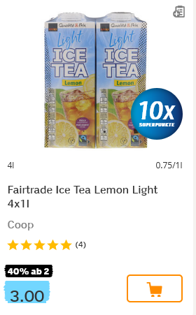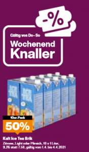 Gemäss Migros Magazin gibt es vom 01.04. - 04.04.2021 die 10er-Brik vom Kult Ice Tea mit sagenhaften 50 % Rabatt und kostet CHF 3.75 anstatt CHF 7.50.