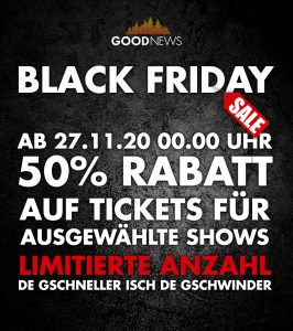 Ankündigung vom Black Friday Sale für Good News Productions AG-Konzerte. Ab dem 27. November 2020 00:00 Uhr gibt es 50% Rabatt auf ausgewählte Veranstaltungen von Good News.