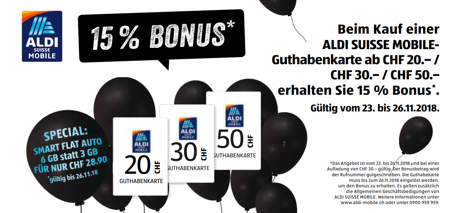 Vom 23. bis 26.11.2018 gibt es in den Filialen beim Kauf einer Aldi Suisse Mobile-Guthabenkarte einen Bonus von 15%.