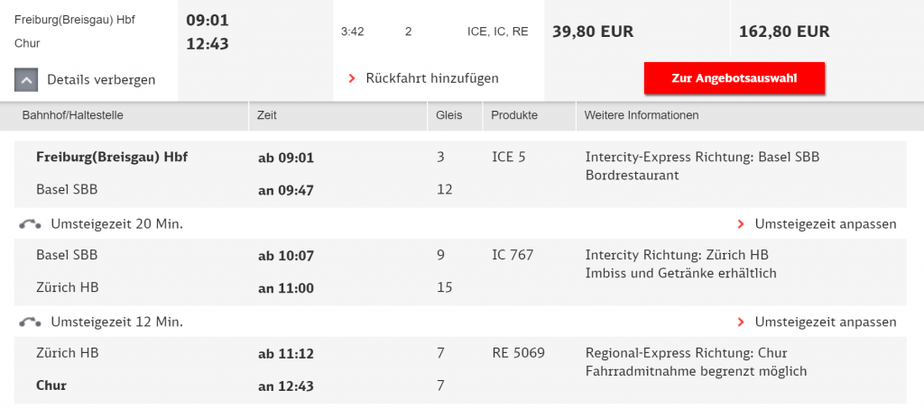 • Der Trick funktioniert auch bei kleinen Abfahrts- oder Ankunftsbahnhöfen in der Schweiz, wenn die Fahrt via Zürich oder Basel geht