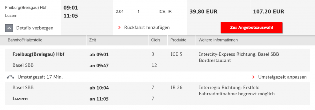 • Wähle als Start- oder Zielpunkt Baden-Baden oder Freiburg (Breisgau) Hbf wenn du ab/bis Basel fahren möchtest