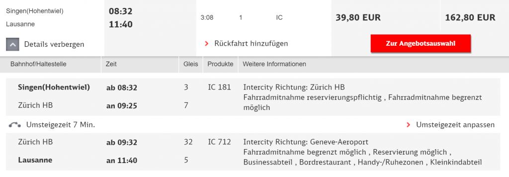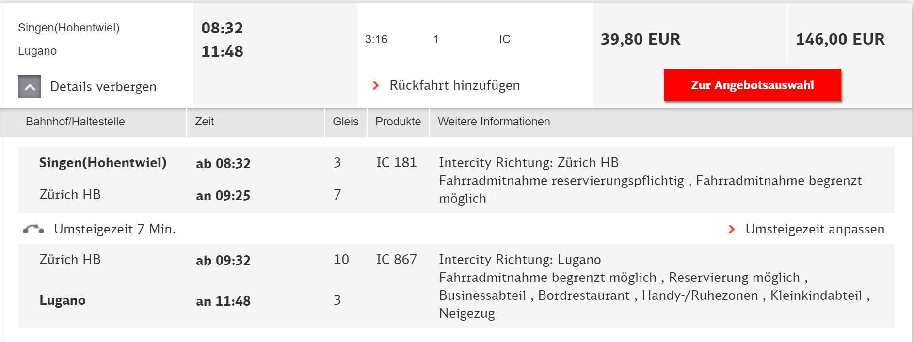 • Wähle als Start- oder Zielpunkt Singen(Hohentwiel) wenn du ab/bis Zürich fahren willst