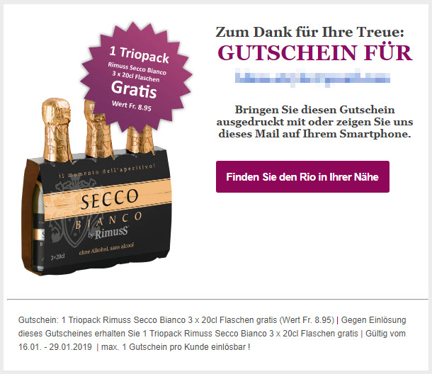 Wenn man sich beim Newsletter des Rio Getränkemarkt anmeldet, erhält man pro Monat rund 2 bis 3 Infos per E-Mail. In jedem Newsletter gibt es einen Bon für ein kostenloses Geschenk (die Getränke wechseln ständig) und die Einlösung klappte bisher anstandslos ohne einen Kauf von anderen Waren.