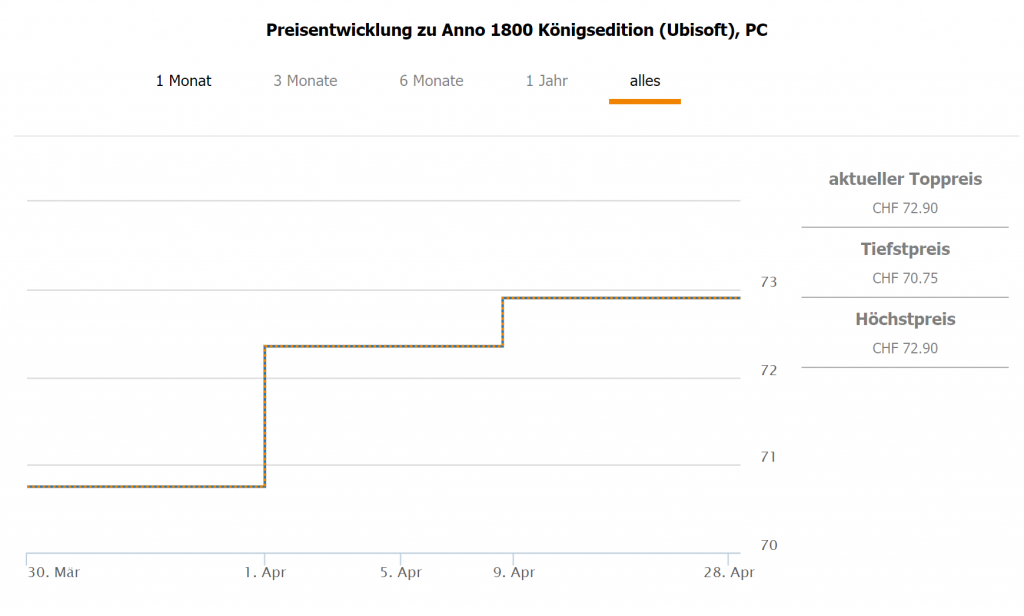 Bei Amazon gibt’s Anno 1800 in der Königsedition inklusive Lieferung in die Schweiz und Verzollung für CHF 57.35 Nächstbester Preis in der Schweiz beträgt CHF 64.80, wobei viele Händler deutlich teurer sind.