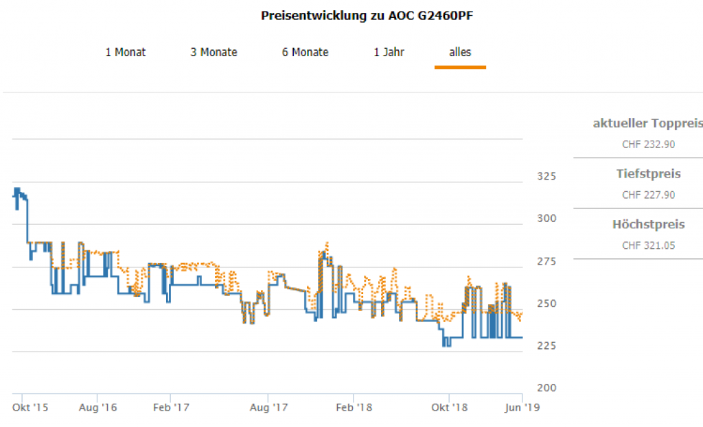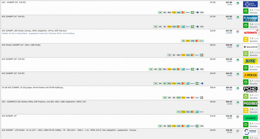 digitec hat heute im Tagesangebot den AOC G2460PF (24″, 1920 x 1080 Pixels) Monitor für CHF 199.-. Laut toppreise.ch ist das das erste Mal, dass das Gerät für weniger als 200 Franken angeboten wird. Der Vergleichspreis liegt bei CHF 247.80.