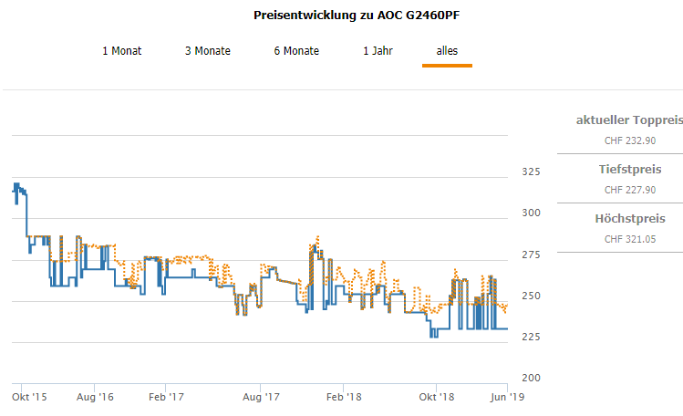 digitec hat heute im Tagesangebot den AOC G2460PF (24″, 1920 x 1080 Pixels) Monitor für CHF 199.-. Laut toppreise.ch ist das das erste Mal, dass das Gerät für weniger als 200 Franken angeboten wird. Der Vergleichspreis liegt bei CHF 247.80.