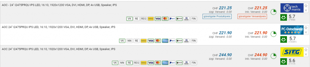 Bei techmania gibt es den AOC I2475PRQU Monitor für den neuen Bestpreis von CHF  221.25. Der vorherige Bestpreis und auch zweitbeste Preis beträgt CHF 244.90.
