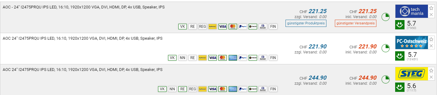 Bei techmania gibt es den AOC I2475PRQU Monitor für den neuen Bestpreis von CHF  221.25. Der vorherige Bestpreis und auch zweitbeste Preis beträgt CHF 244.90.