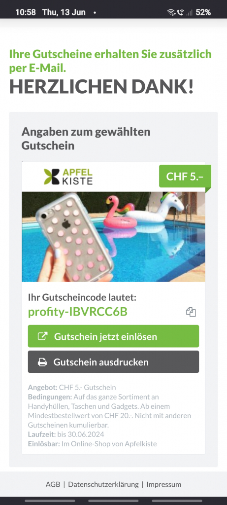 Über einen alten Black Friday-Link kann man sich für den Newsletter anmelden und dann bis zu drei Profity-Gutscheine auswählen, unter anderem den von Apfelkiste. Es ist immer derselbe Code für einen Monat, deshalb kann ich ihn gefahrlos teilen.