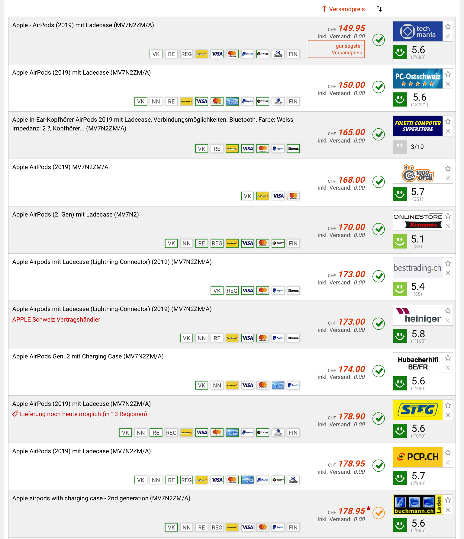 Bei techmania (und PC Ostschweiz) gibt es die AirPods für 149.95 CHF, zweitbester Preis sind 165.- CHF.