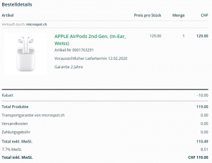 Bei Microspot gibt es aktuell die AirPods 2nd Gen. für 119.- (bereits abgezogen die 10.- vom Rubbel Gewinnspiel https://microspot-ch-de.basebuilder.com/?ref_a=scratch-homepage)