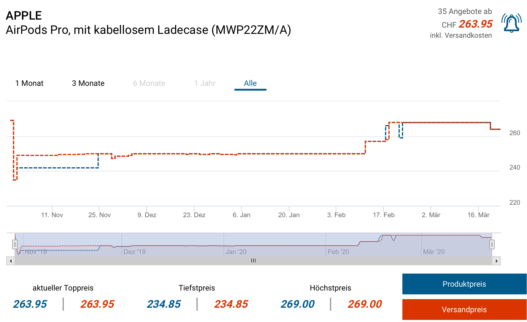 Bei amazon.fr gibt es aktuell die APPLE AirPods Pro für 226.48 EUR.