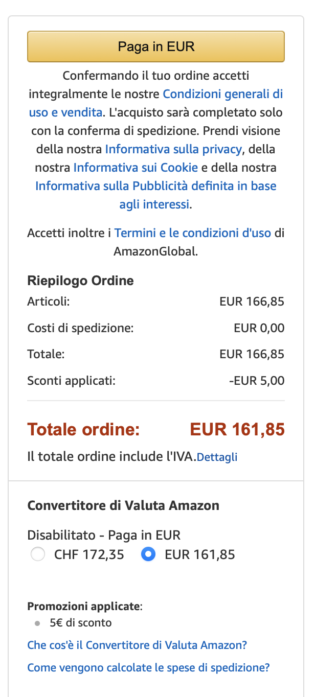 • Für Lieferungen in die Schweiz wird der Preis erst bei Angabe einer Schweizer Lieferadresse richtig angezeigt (Abzug der Mehrwertsteuer, zuzüglich Versandkosten) resp. beim Checkout an der Kasse (Amazon Frankreich, Italien, Spanien und Grossbritannien). Wir verwenden grundsätzlich den Interbanken-Kurs für die Umrechnung in CHF.