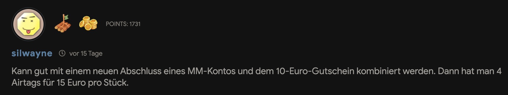 "Kann gut mit einem neuen Abschluss eines MM-Kontos und dem 10-Euro-Gutschein kombiniert werden. Dann hat man 4 Airtags für 15 Euro pro Stück."
