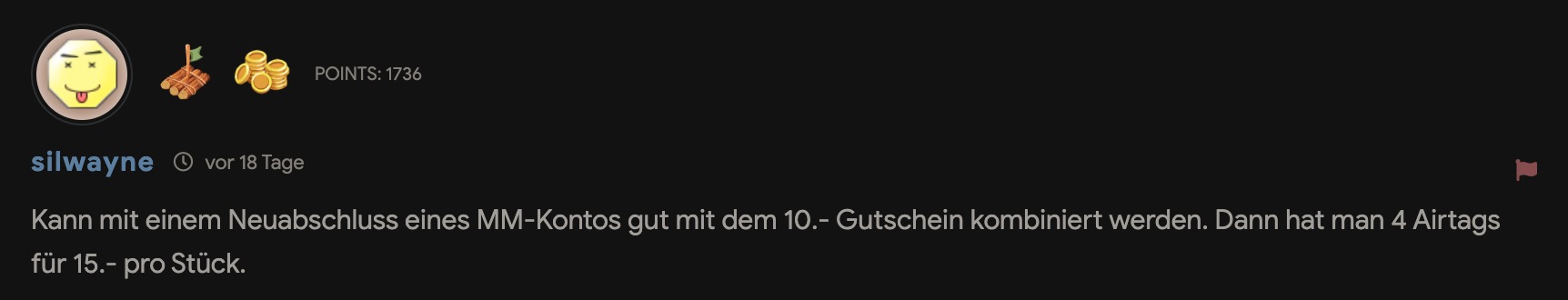 Kann mit einem Neuabschluss eines MM-Kontos gut mit dem 10.- Gutschein kombiniert werden. Dann hat man 4 Airtags für 15.- pro Stück.