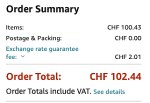 - Für Lieferungen in die Schweiz wird der Preis erst bei Angabe einer Schweizer Lieferadresse richtig angezeigt (Abzug der Mehrwertsteuer, zuzüglich Versandkosten) resp. beim Checkout an der Kasse (Amazon Frankreich, Italien, Spanien und Grossbritannien). Wir verwenden grundsätzlich den Interbanken-Kurs für die Umrechnung in CHF.