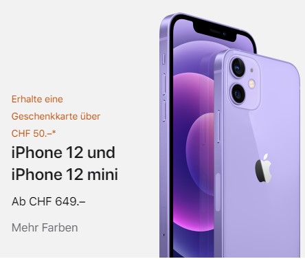 * Das Angebot ist gültig für qualifizierte Käufe von qualifizierten Apple Produkten, die in der Schweiz im Zeitraum vom 26. November 2021 bis zum 29. November 2021 in Apple Stores, im Apple Online Store, in der Apple Store App und telefonisch unter 0800 801 078 getätigt werden. Für qualifizierte Käufe kann ein Rabatt entsprechend dem Wert der qualifizierten App Store & iTunes Geschenkkarte auf den Preis des qualifizierten Produkts angerechnet werden. Alle Artikel werden beim Bezahlen abgerechnet, inklusive der App Store & iTunes Geschenkkarte. Qualifizierte Produkte, die an einer qualifizierten Verkaufsstelle mit einer Finanzierung gekauft wurden, sind nicht für dieses Angebot qualifiziert. Dieses Angebot kann nicht mit dem Corporate Employee Purchase Program oder Treuerabatten für den Bildungsbereich bzw. für Unternehmen kombiniert werden. Es gelten die vollständigen Angebotsbestimmungen, siehe hier.