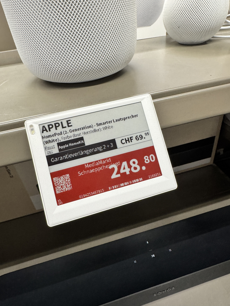 Zufällig in der Filiale Winterthur Neuwiesen gesehen, der weisse Apple Homepod (gross, nicht mini) ist für CHF 248.80 zu haben im zuge der MediaMarkt Schnäppchenmarkt. Das schwarze Modell ist ebenfalls reduziert erhältlich, jedoch zu einem höheren Preis.