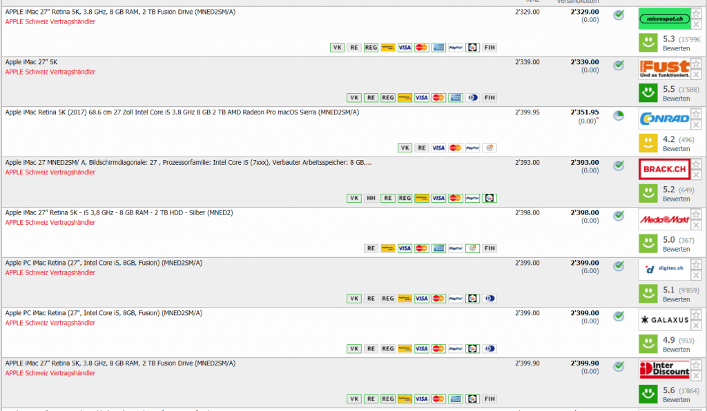 Bei microspot gibt’s gerade den iMac 27″ mit Quadcore 3.8 GHz, 2TB Speicherplatz und dem Retina 5k Display für CHF 1’999.- wenn man den Gutschein APFEL202018 einsetzt. Der zweitbeste Preis in der Schweiz beträgt CHF 2’339.- Günstiger als für CHF 2’046.90 gab’s diesen iMac noch nie.