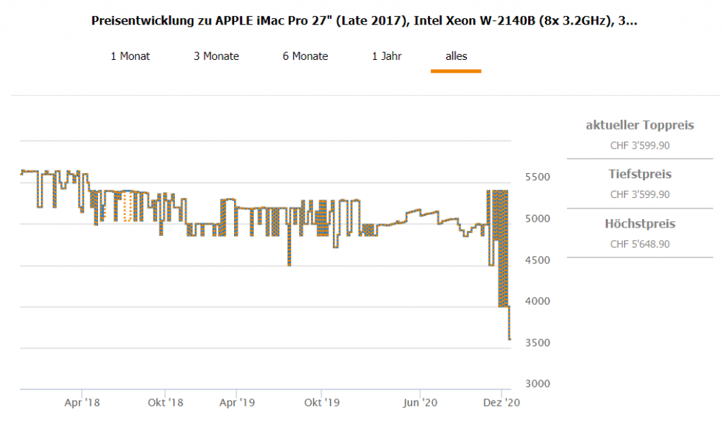 Naja, wer’s braucht findet gerade den APPLE iMac Pro 27″ (Late 2017), Intel Xeon W-2140B (8x 3.2GHz), 32GB RAM, 1.0TB SSD, Standardkonfiguration (MQ2Y2SM/A) für CHF 3599.90 bei Interdiscount. Muss jeder für sich selber entscheiden, ob das System so viel Geld wert ist. Aber derzeit vergleichsweise günstig. Zweitbester Preis liegt bei knapp 4000 Franken.