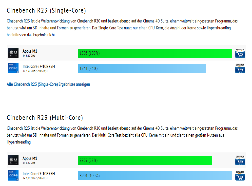 Bei einem M1 Max aus den aktuellen 14"/16" MacBook Pros, die man wohl auch in den demnächst erscheinenden Nachfolgern dieser iMacs finden wird, muss man hingegen schon sehr lange suchen, bis man einen Benchmark findet, wo der i7 mal schneller ist.