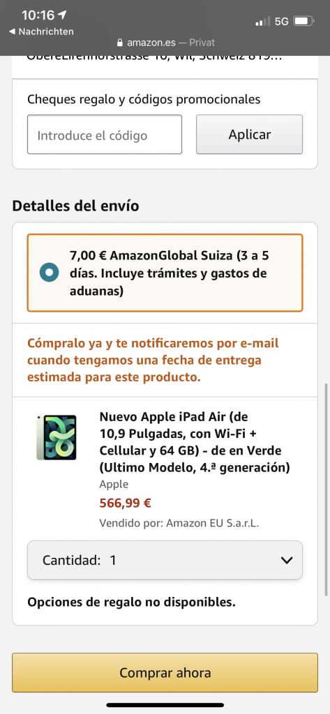 Apple iPad Air 4 Tablet - 64GB, LTE, Grün für 573.99€ = CHF 631.- inkl. Versand bei Amazon.es. Bezahlen könnt ihr mit Kreditkarte oder SEPA, einloggen mit deutschem Amazon-Account möglich.