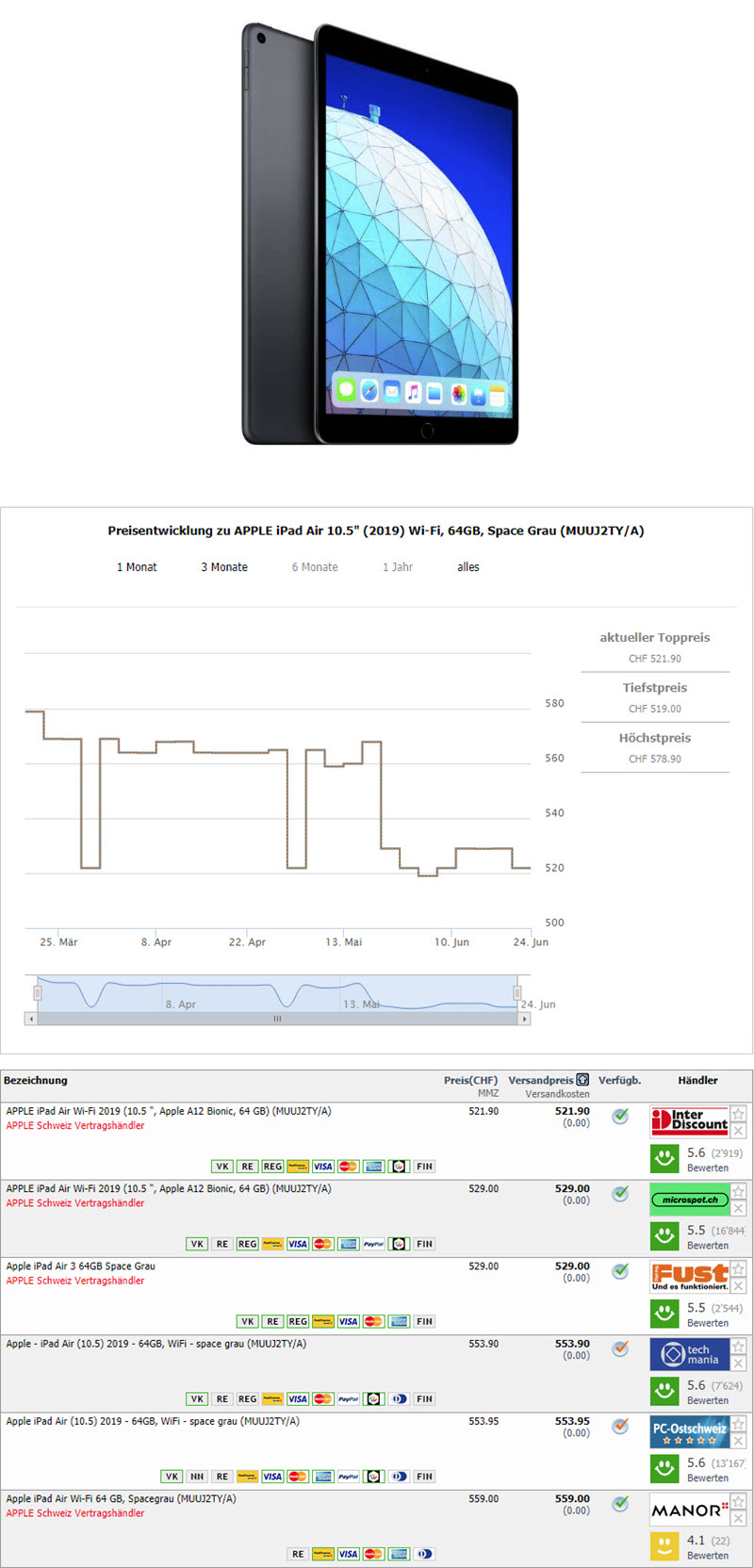 Anlässlich des Spot Days gibt es bei Microspot aktuell das APPLE iPad Air Wi-Fi 2019 (10.5″, A12 Bionic, 64 GB) in diversen Farben zum Bestpreis von CHF 479.-.