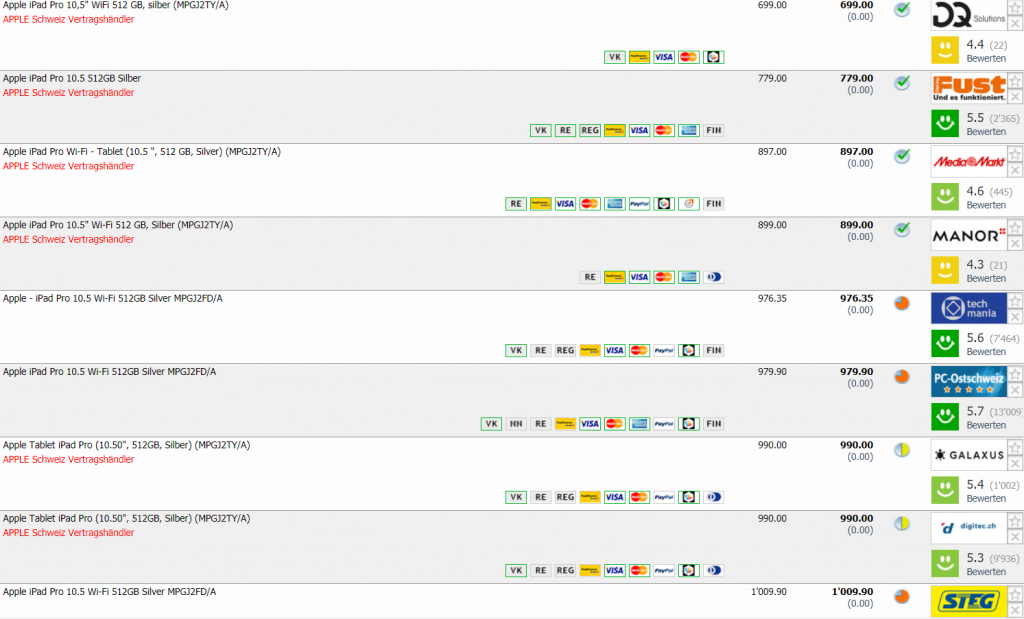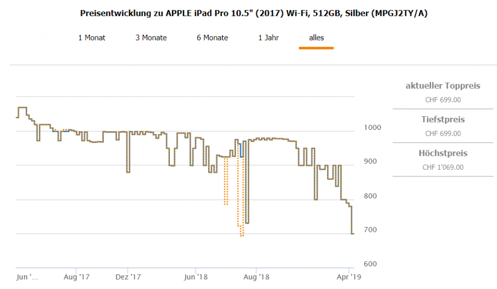 Bei DQ Solution gibt’s die grosse Version des iPad Pro für CHF 699.- in verschiedenen Farben. Zweitbester Preis liegt bei CHF 779.- Bestpreis war noch etwas tiefer, bei CHF 693.05
