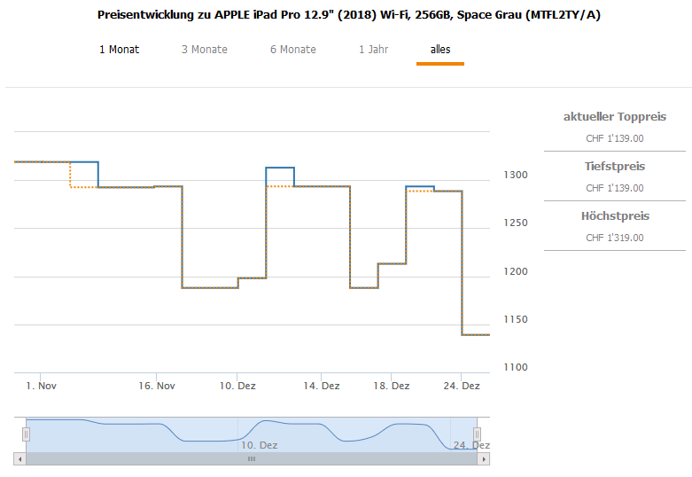 Gemäss toppreise war der bestprice bislang bei 1187.90 CHF, der zweitbeste Preis liegt aktuell bei 1288.55 CHF.