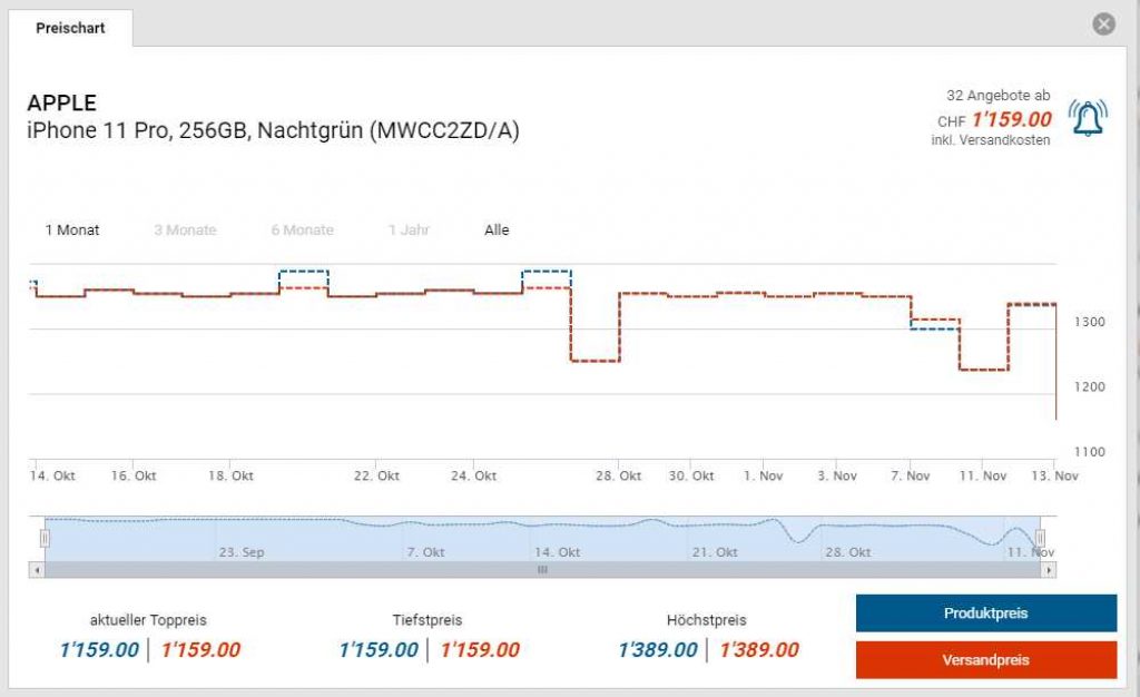 Bei remarket gibt es das APPLE iPhone 11 Pro, 256GB, Nachtgrün für den neuen Bestpreis von CHF 1159.-. Der vorherige Bestpreis war CHF 1236.20. Der zweitbeste Preis beträgt CHF 1362.15.